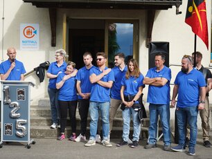 Dann hiess es: umziehen und bereit machen für das Vereinsfoto. Gestaffelt wurde eingestanden, die Fahne wurde positioniert und der Fotograf Simon Stierli gab vom Traktor aus letzte Anweisungen.