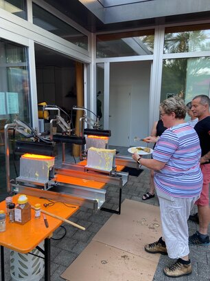 Nach einem kurzen Apéro und dem Abwarten bis die Kartoffeln soweit waren, konnten wir mit dem Raclette beginnen. Dieses Mal nicht mit kleinen Öfen auf dem Tisch, sondern mit drei grösseren Öfen, an denen der Käse abgestrichen wurde. An dieser Stelle danke ich Nicole Schaub für das Organisieren der Öfen und des Käses.