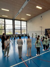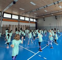 Nach Sören stand auch schon der zweite Besuch des Tages vor der Tür. Die Mädchen der Gymnastik Jugend zeigten uns einen Ausschnitt ihres neuen Tanzes. Grossartig, was die Mädchen schon können! Anschliessend durfte auch die Mädchenriege mittanzen und einen Tanzschritt lernen.