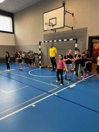 Im Anschluss erhielten wir unseren ersten Besuch des Tages. Sören vom Volleyball Kids kam zu uns in die Turnhalle und zeigte den Mädchen, wie so ein Volleyball-Training aussehen kann. Die Bälle wurden über den Boden einander zugespielt, das erste Anspiel wurde geübt und die ersten Rotationen wurden versucht.