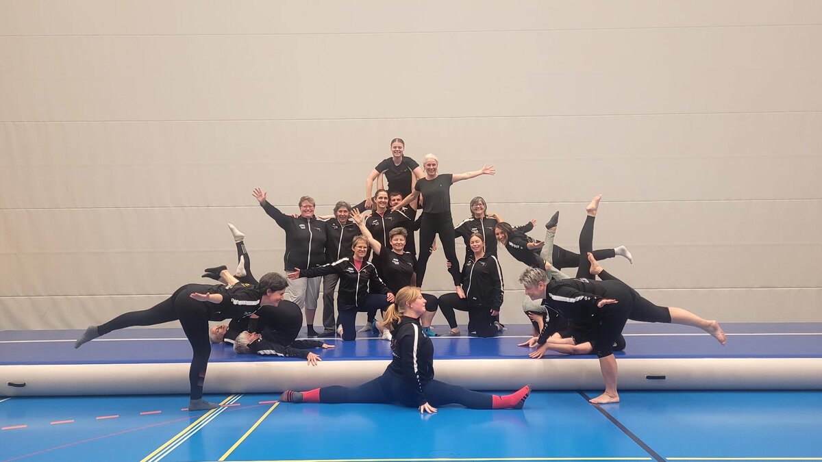 Für unser Gruppenfoto versuchten wir diverse Figuren aus und Sarah koordinierte dann die Aufstellung für unser Bild. Der Air Track wurde dann auch kurzerhand zum Catwalk umgewandelt - Lachfalten garantiert!