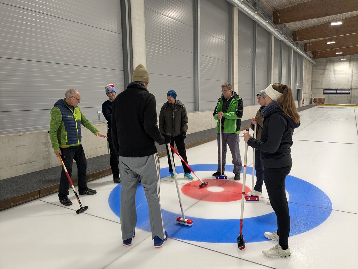 Die 16 Enthusiasten wurden auf zwei Bahnen verteilt, wo wir 4 gegen 4 in gemischten Teams spielten. Uns standen zwei Coaches zur Verfügung, die uns durch den ganzen Prozess begleiteten. Ob wir schon Erfahrung hätten, wurden wir gefragt. Einige meinten, dass die vielen Stunden auf dem Sofa mit Olympia-Schauen doch auch mitzählen sollten, aber da hatten wir uns ein wenig geirrt. So einfach, wie die Profis es im Fernsehen aussehen lassen, ist es nicht: Schon elegant über das Eis zu gleiten ist schwierig, geschweige denn, einen Stein richtig zu stossen!