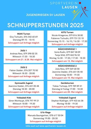 Erstellt von Michael Stucki | | Verein, Volleyball Kids, Gymnastik Jugend, Geräteturnen Jugend, News, Jugend U16 mixed, Knabenriege 2, Knabenriege 1, Mädchenriege 2, Mädchenriege 1, KITU, MUKI Turnen, Volleyball JugendWeiterlesenWenn du schon immer einmal in einer unserer Jugendriegen reinschnuppern wolltest, ist jetzt ein guter Zeitpunkt.